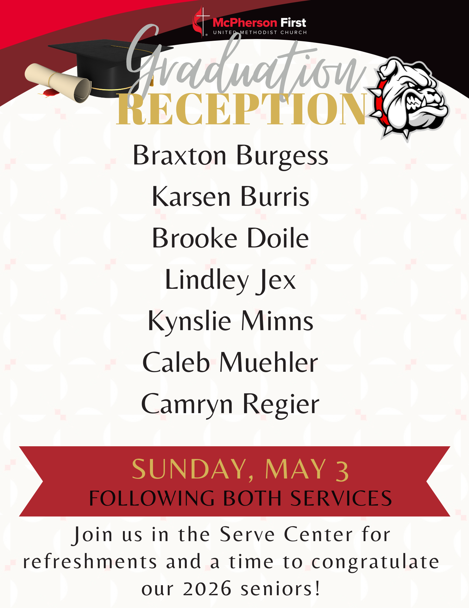 Graduates: Please submit your information and senior photos to Sarah Hendricks at sarah.hendricks@mcphersonfirst.org by April 20, 2026. We need your favorite Bible verse, a church memory, any confirmation memories, an adult who has impacted you, and your post-high school plans.